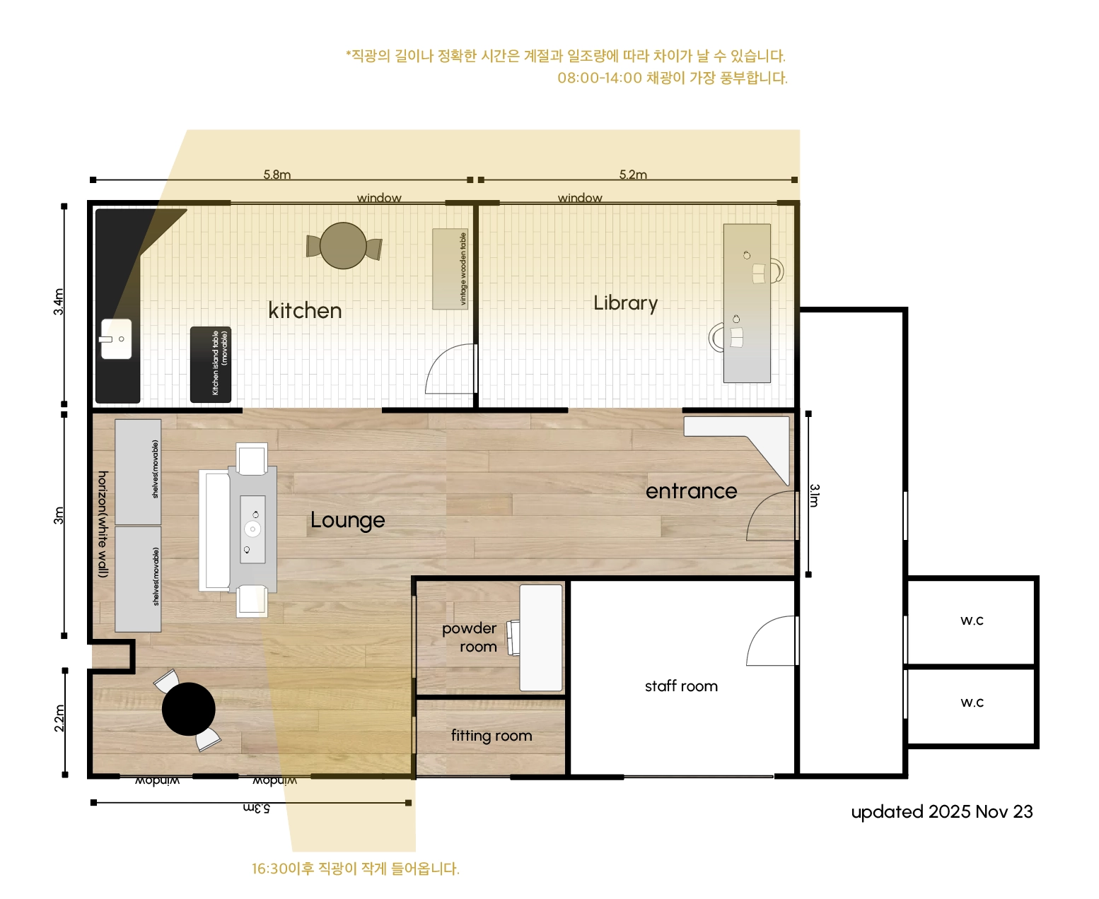이번 리뉴얼은 일부 공간 바닥톤과 공간 분리감만 생기는 정도라 전체적인 구조와 인테리어는 유지됩니다. 해당 공간은 평면도 참고 부탁드립니다.